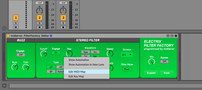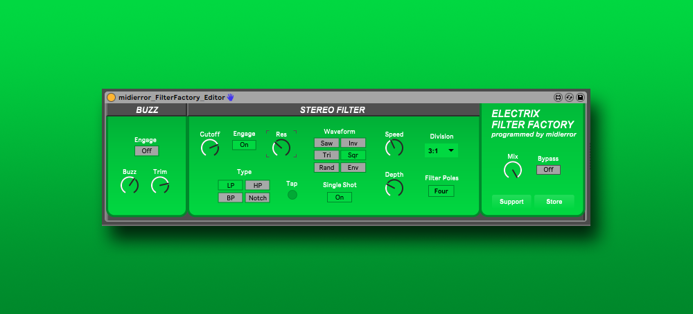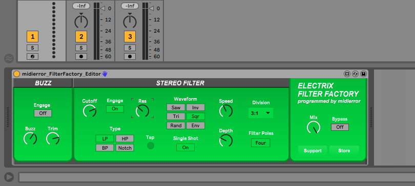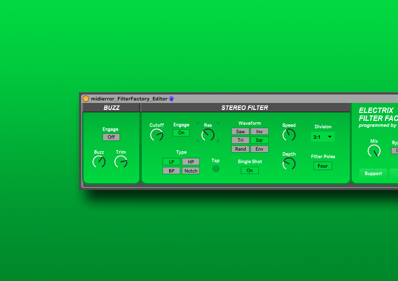 This Max4Live editor give you control over every function of the Electrix Filter Factory in Ableton Live. Edit parameters for Buzz, Filter Type, Cutoff, LFO Speed, Tap Tempo and more! Each paramter can be controlled by an external MIDI controller and automated within your track.